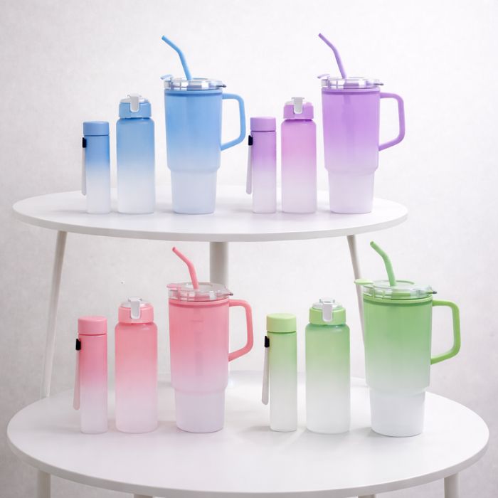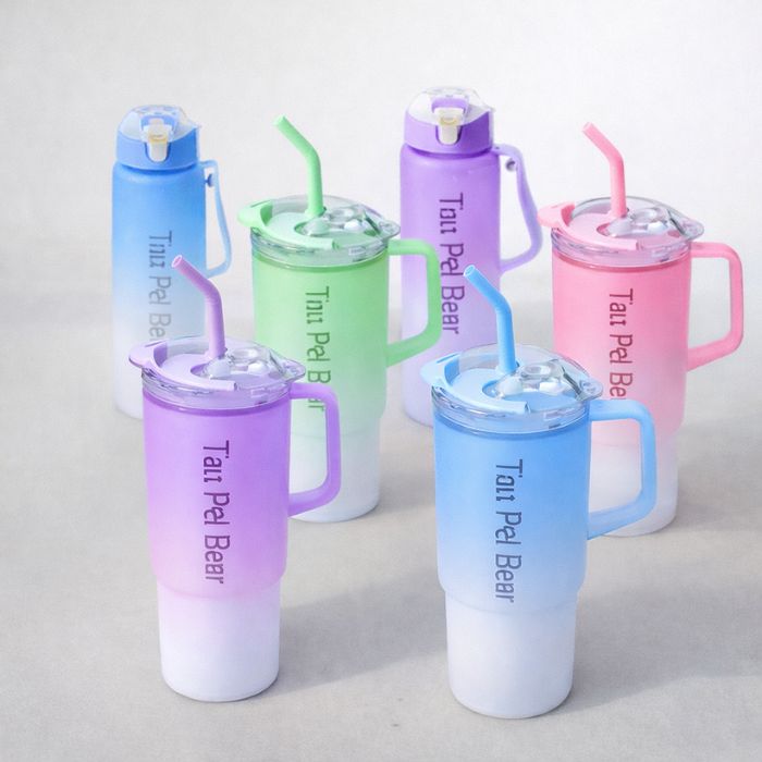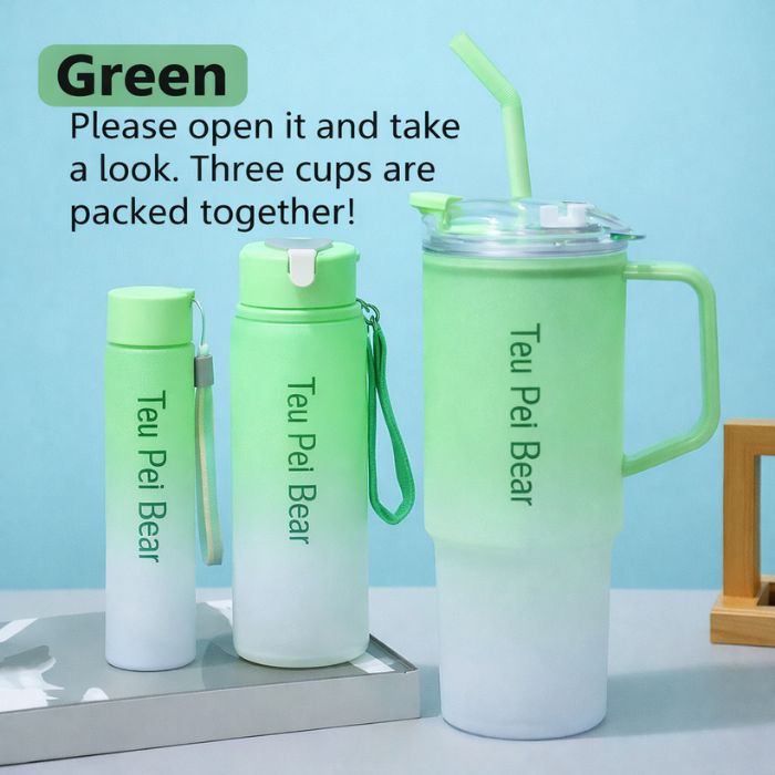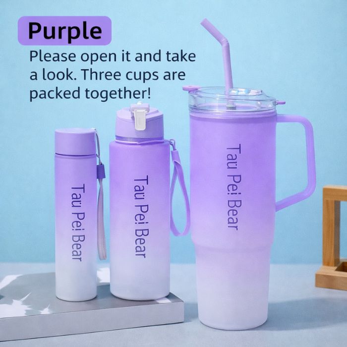 Stay hydrated in style with the Tau Pei Bear 3-in-1 Water Bottle Set, featuring a stunning gradient design and versatile capacity. This set includes one 2L large-capacity bottle with a straw and two additional mini bottles, all packed conveniently in one. This set is ideal for use in various settings such as the gym, home, travel, school, or outdoor activities.