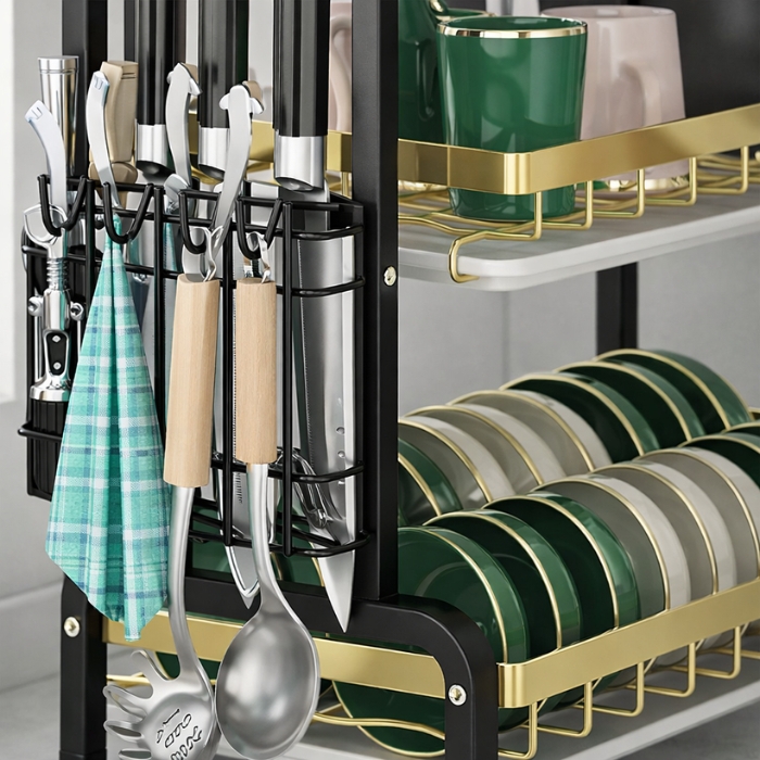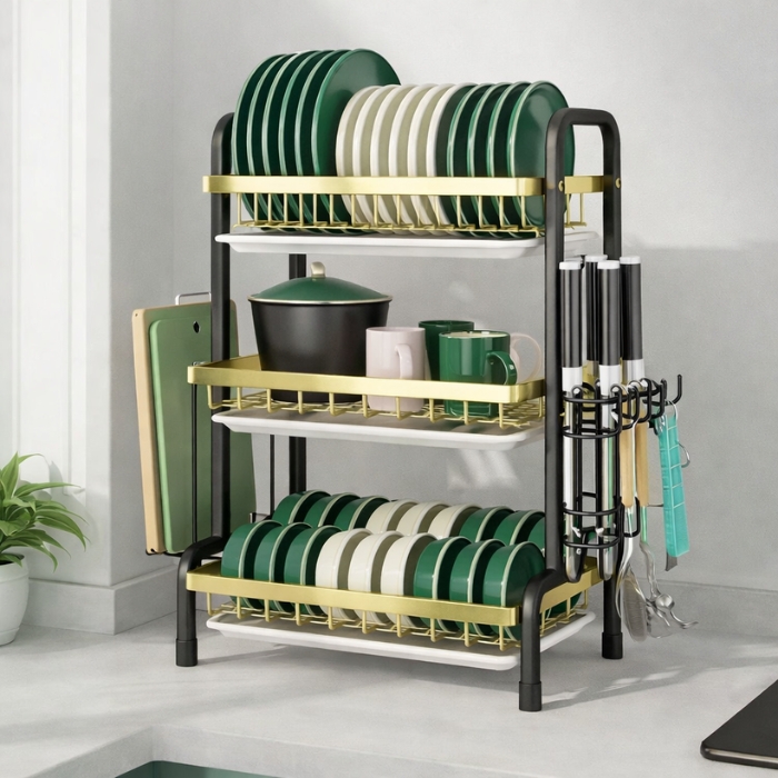 Constructed from premium carbon steel with a rustproof coating, the rack is strong enough to hold heavy plates and cookware without bending. Its 3-tier vertical design maximizes storage space, making it ideal for small and large kitchens alike. The open structure allows water to drain easily, promoting faster drying and better hygiene.