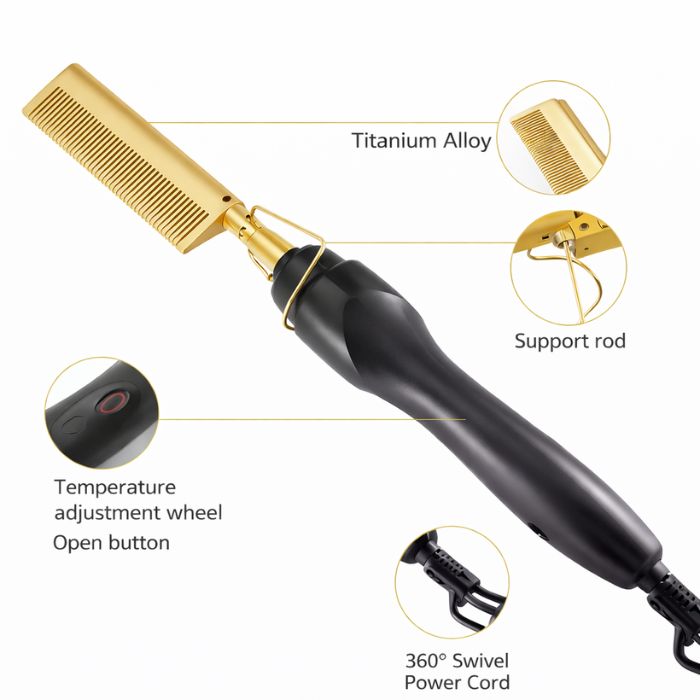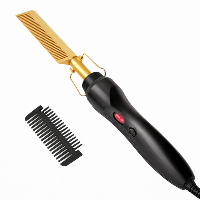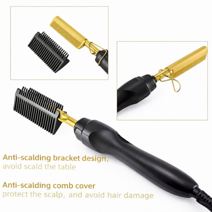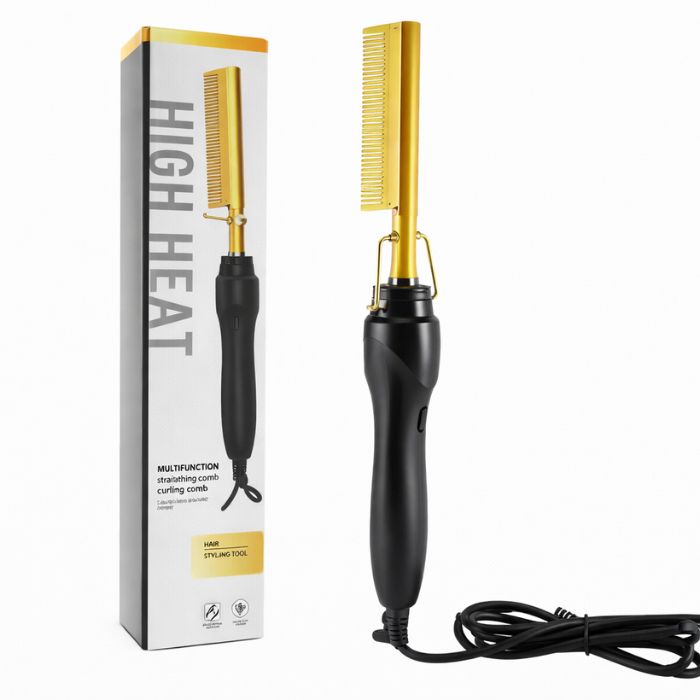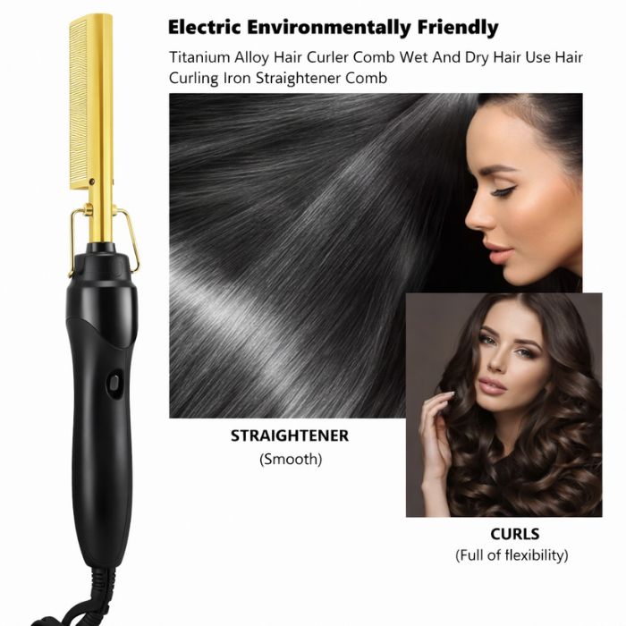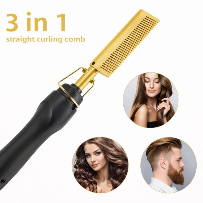 Achieve salon-quality results at home with this 3-in-1 Electric Hot Comb, designed to straighten, curl, and style all hair types quickly and safely. Crafted with a titanium alloy comb head, this hot comb heats evenly to deliver silky-smooth, frizz-free hair while protecting your scalp from burns with an anti-scald guard.
