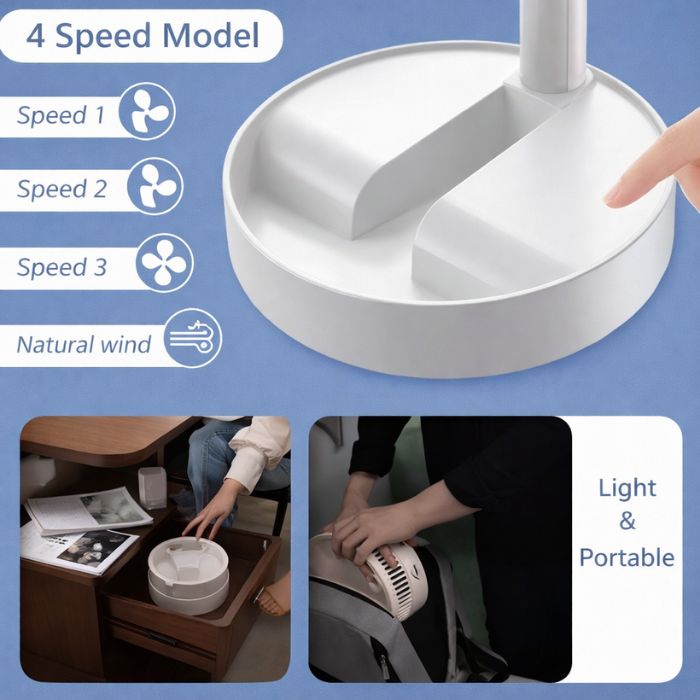 With 4-speed wind settings, including a natural breeze mode, it delivers customizable airflow quietly and efficiently. The rechargeable battery ensures cordless convenience, and the lightweight build makes it easy to fold and carry wherever you go.