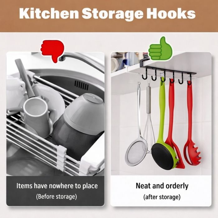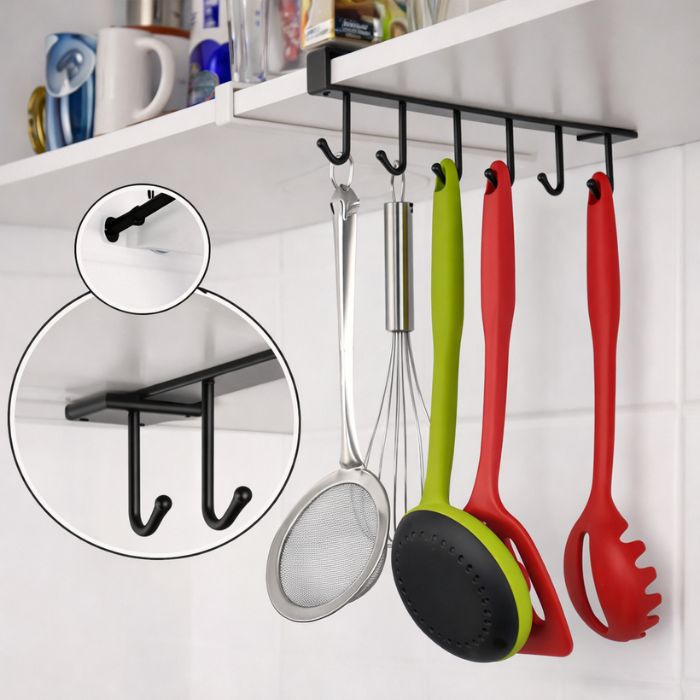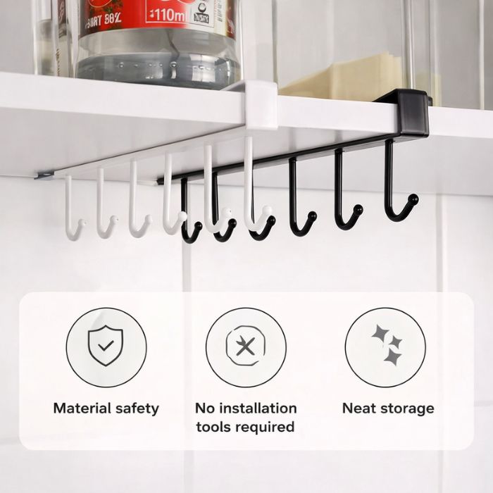 Maximize your kitchen space with our under-cabinet Kitchen Storage Hooks. Designed for convenience and style, this no-drill hanging rack easily attaches to shelves or cupboards and provides multiple hooks for hanging utensils, mugs, towels, or kitchen tools. Made with durable materials and available in elegant black and white, it’s the perfect minimalist solution for a clutter-free kitchen.