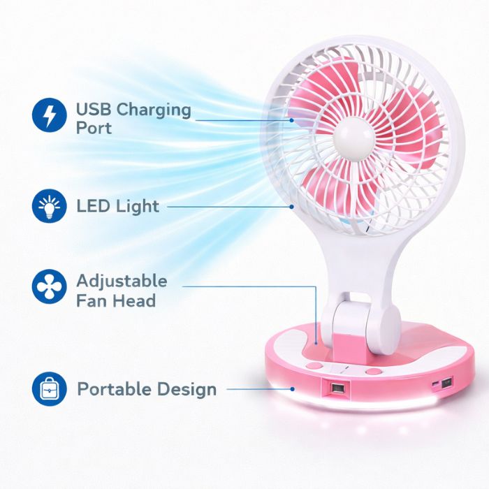 Stay cool and comfortable wherever you go with the 5580 Portable LED Mini Fan. This stylish and compact fan is designed for versatility and performance. Featuring an integrated LED night light, USB charging, and 3 powerful fan blades, it’s perfect for bedside tables, office desks, or travel use.